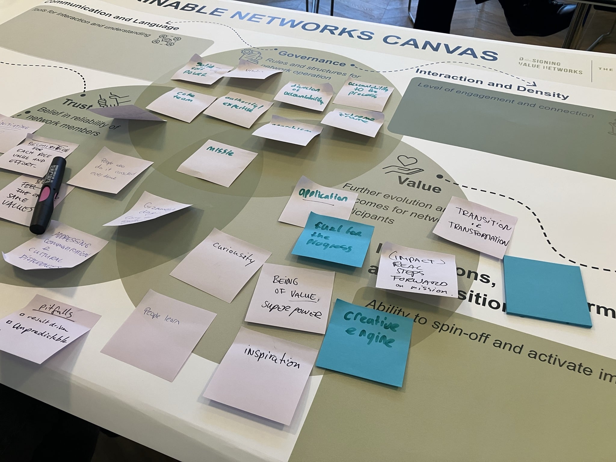 Dividing the tables into four themes, namely creative, academic, agriculture, and healthcare. Putting the learned theory into practice, the participants delved into the canvas and played with the tool’s elements to explore and discuss the networks and their challenges.